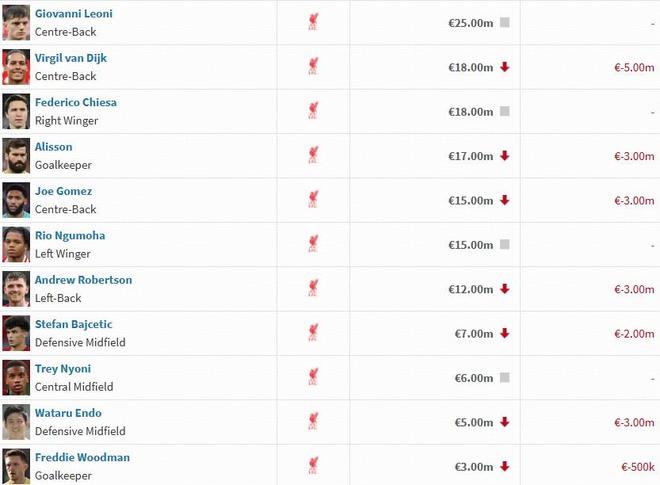 北京时间12月9日英超日报,德转公布了新一期的英超身价榜,利物浦这边无人上涨多人下跌,伊萨克维尔茨下跌2000万欧,萨拉赫下跌1500万欧。